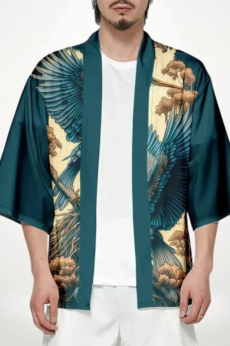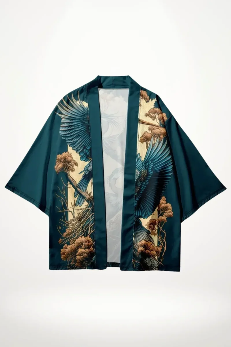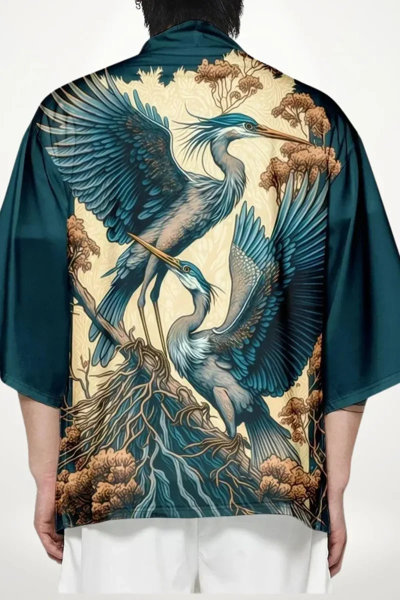Plongez dans l’univers singulier de ce yukata kimono homme, où tradition et modernité se rejoignent dans une même silhouette. Confectionné en polyester léger et résistant, il arbore au dos un motif de hérons bleu canard et beige sable, symboles intemporels de longévité et de prospérité, évoluant au-dessus de racines stylisées qui suggèrent l’équilibre entre stabilité et liberté.