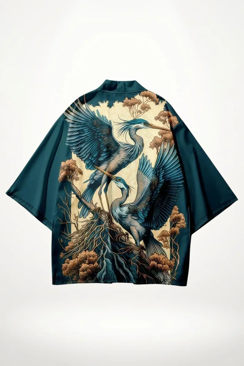 Ce modèle associe l’élégance graphique des représentations japonaises à une esthétique contemporaine. Le motif de hérons stylisés, dessiné avec finesse, compose une atmosphère poétique et moderne, offrant à ce vêtement une dimension à la fois symbolique et actuelle.