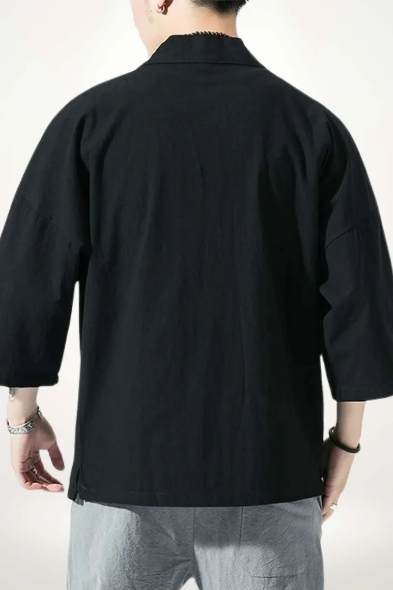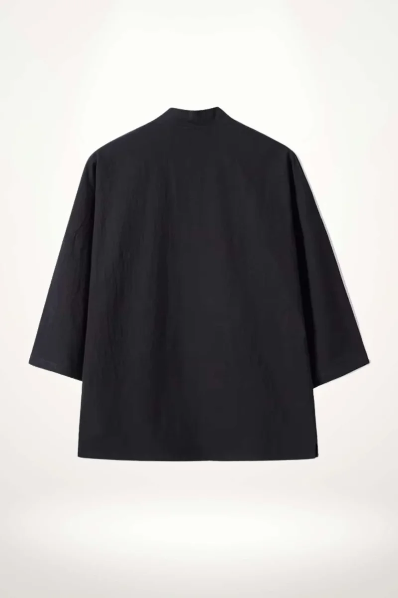 La matière en coton et lin confère au kimono jacket homme une texture naturelle, respirante et agréable au toucher, très agréable pour les saisons tempérées. Sa teinte noire profonde offre une base neutre, facile à associer avec d’autres pièces de votre garde-robe.