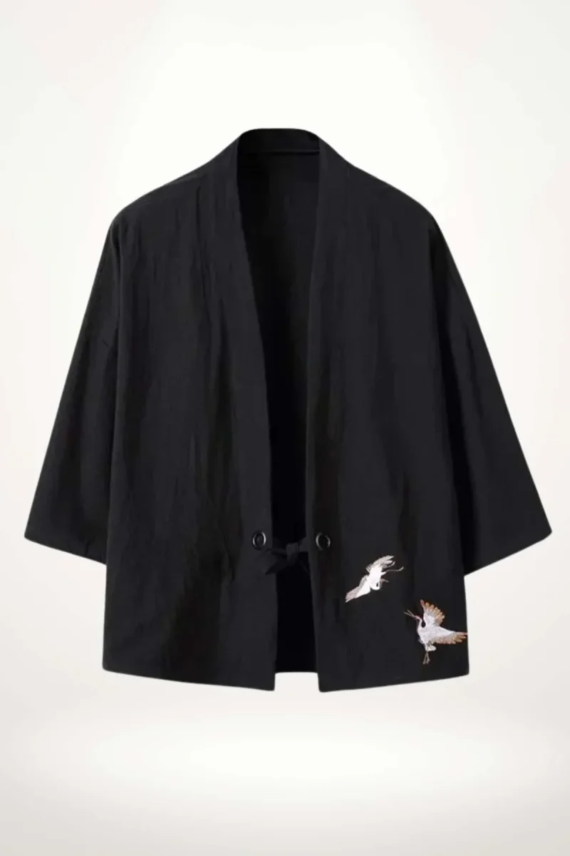 Le kimono présente une ouverture frontale simple, agrémentée d’un lien plat noir qui permet un ajustement discret. Les manches larges trois-quarts accentuent la liberté de mouvement et renforcent l’allure décontractée. La broderie de grues, symbole de longévité et de noblesse dans la culture japonaise, est finement réalisée sur le côté droit, apportant une signature visuelle unique.